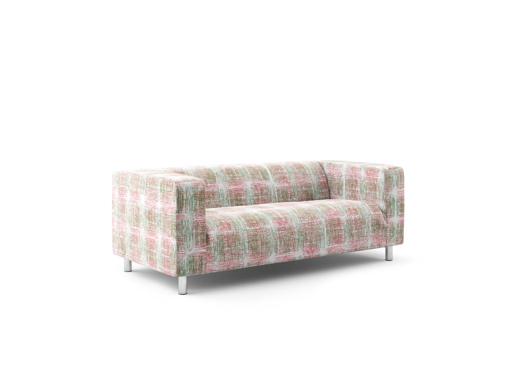 Červeno zelený vzor na bílém pozadí, jehož základem je lineární ruční kresba, která je upravena do čtvercového rastru, odkazujícího na čtvercové, klasické čalounění.