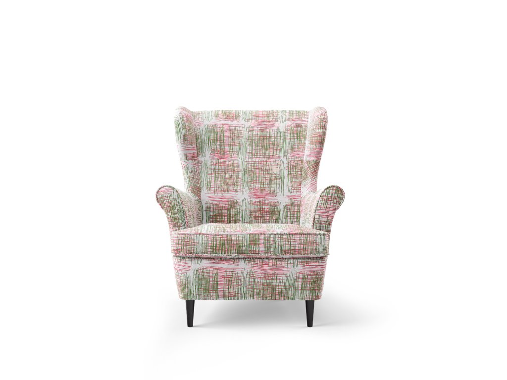 Červeno zelený vzor na bílém pozadí, jehož základem je lineární ruční kresba, která je upravena do čtvercového rastru, odkazujícího na čtvercové, klasické čalounění.