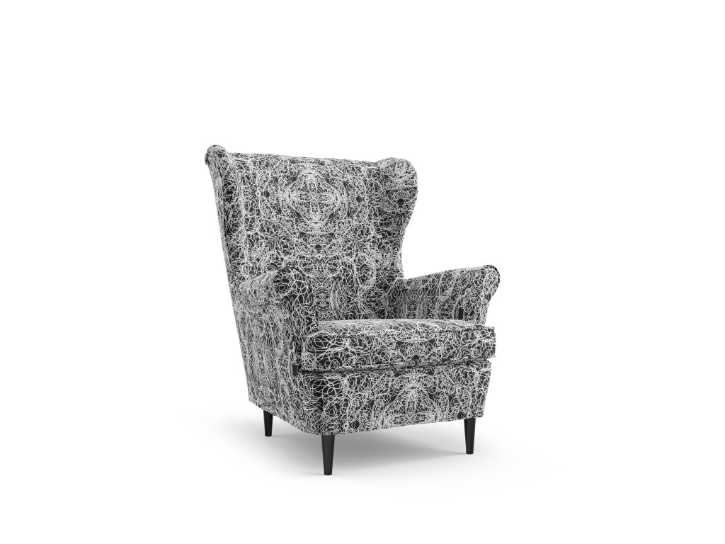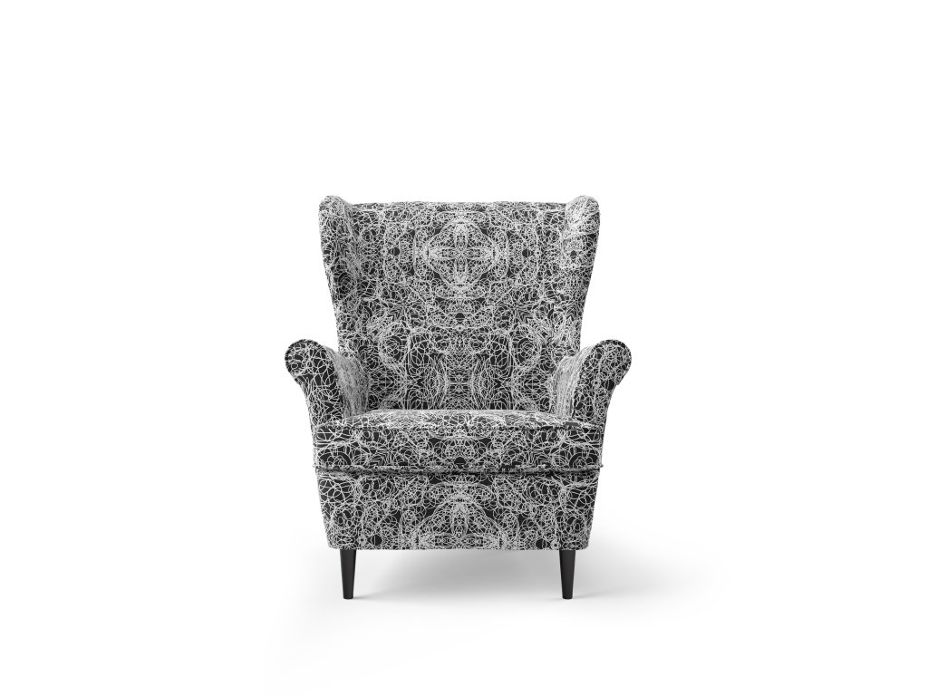 Několik ručních kreseb následně opakovaných, zrcadlením a převracením násobených do bohatého vzoru s orientálním nádechem. Chaotická malá kresbička následnou úpravou tvoří pravidelný bohatý vzor. Jednoduchá černobílá barevnost.