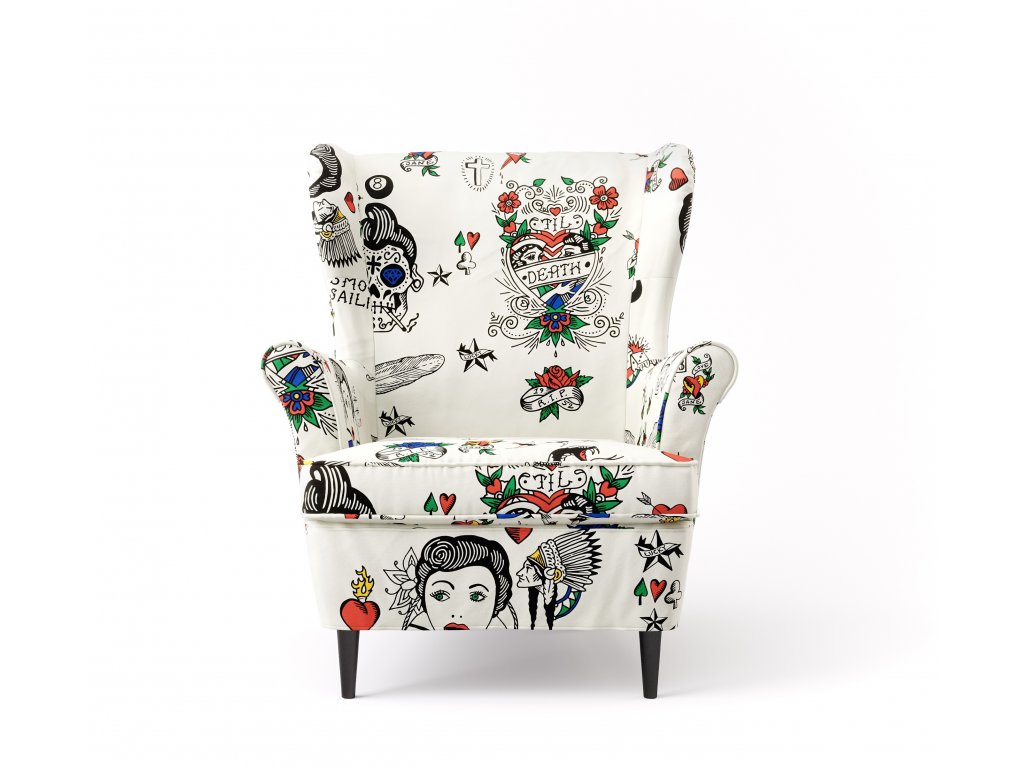 Potah na křeslo Strandmon TATTOO je unikátní kousek, který vám lehce navodí rock and rollovou atmosféru 50. let. Vzor je sestavený z drobných kreslených (tetovaných) motivů - vlaštovky, proklátá srdce, lebky, kosti, karty, pin up… Potah je ideální do stylového kadeřnictví, tetovacího salónu, barber shopu, rock and rockabilly klubu a nebo k vám domů!